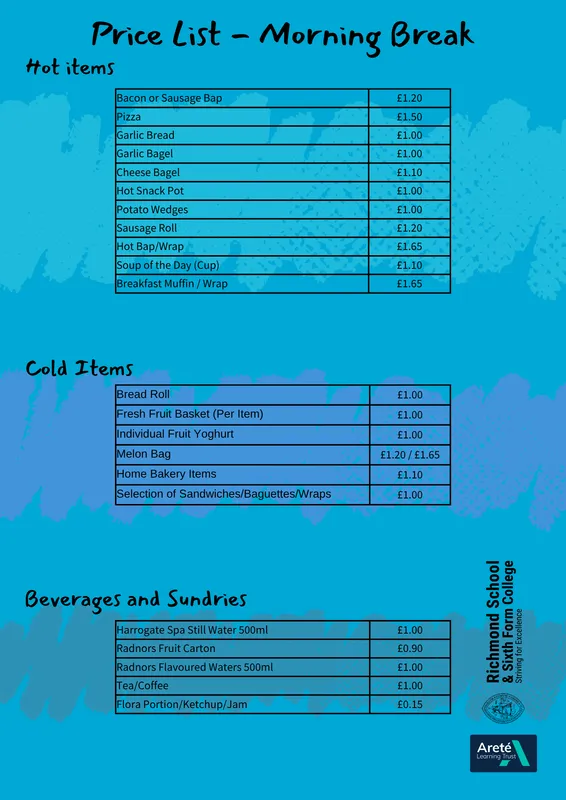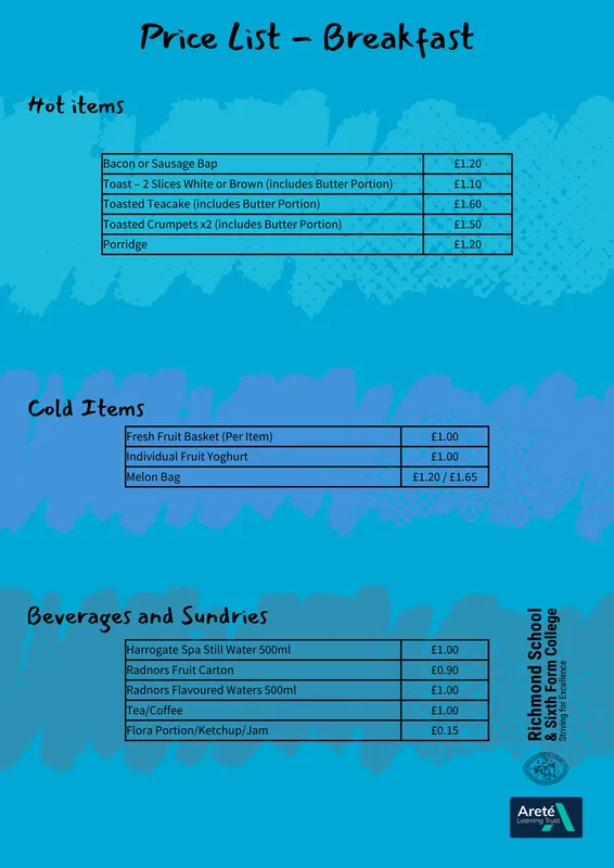 Our meals are freshly prepared and offer a varied and nutritious menu, from a snack at break times to a larger meal at lunch time (*please see below for timings), with a breakfast menu available from 8:15-8:50am. From tray bakes to toasties, meal deals to sandwiches, there is something to suit every taste. Please refer to the menus below for the full offer.